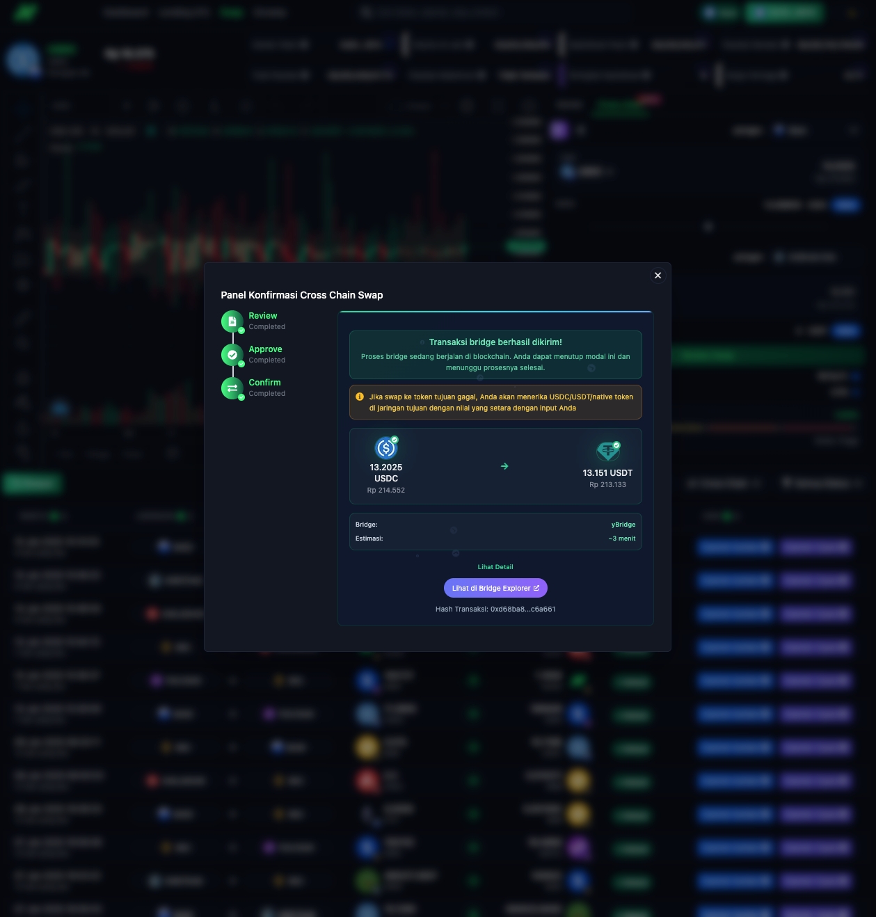 Tunggu hingga transaksi cross-chain selesai, yang mungkin membutuhkan waktu beberapa menit tergantung pada jaringan yang digunakan. Hasil transaksi dapat dilihat di bagian Swap History.